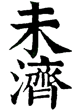 Es ist in dem Zeichen die Zeit angedeutet, da der Übergang aus der Unordnung zur Ordnung noch nicht vollendet ist. Der Umschwung ist zwar schon vorbereitet, indem alle Striche des oberen Trigramms zu denen des unteren in Beziehung stehen. Aber sie sind noch nicht auf ihrem Platz. Während das vorige Zeichen dem Herbst gleicht, der den Übergang vom Sommer zum Winter bildet, ist dieses Zeichen wie der Frühling, der aus der Stockungszeit des Winters in die fruchtbare Zeit des Sommers führt. Mit diesem hoffnungsvollen Ausblick schließt das Buch der Wandlungen ab.